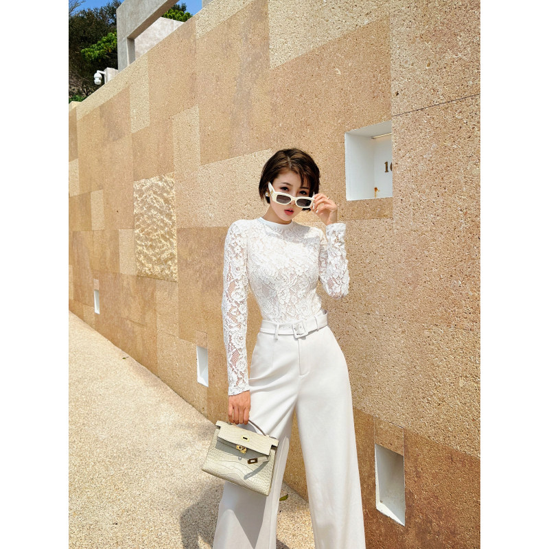 XULU原创新款气质立体高级蕾丝白色打底衫高定圆领长袖连体上衣