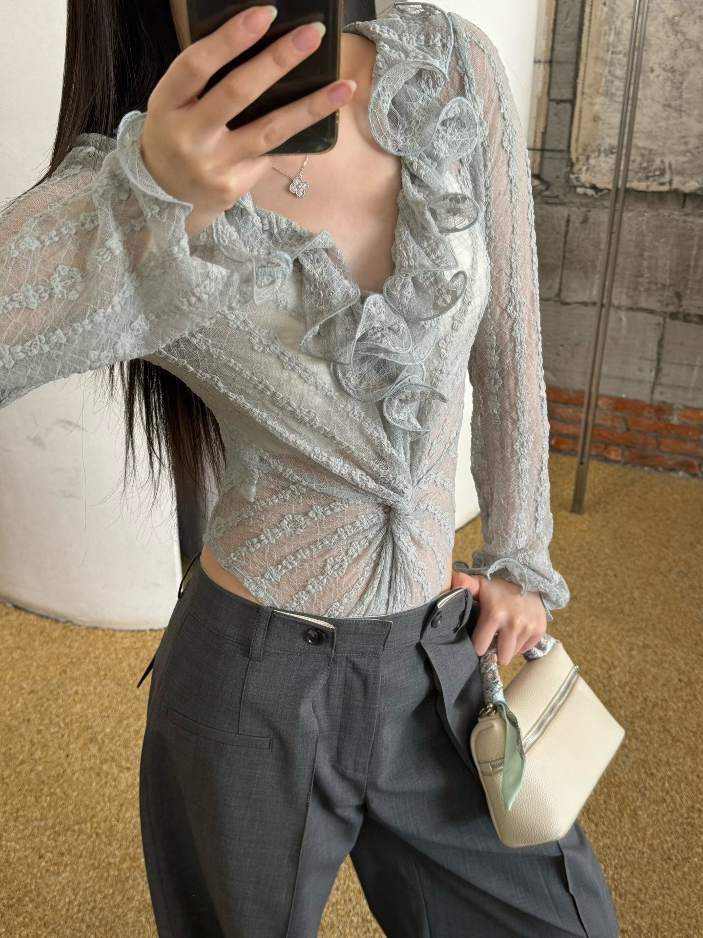 【新款】Cello 高品质 26春 V领长袖蕾丝低领荷叶边连体衣裤修身
