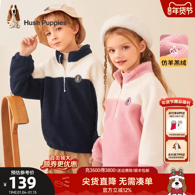 暇步士童装儿童卫衣冬季新款男童仿羊羔绒上衣女童拼色休闲套头衫