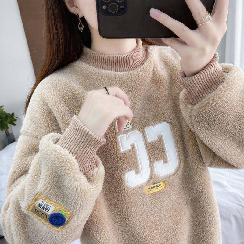 字母羊羔绒卫衣女宽松版套头长袖加绒上衣羊羔毛外套学生外穿穿搭