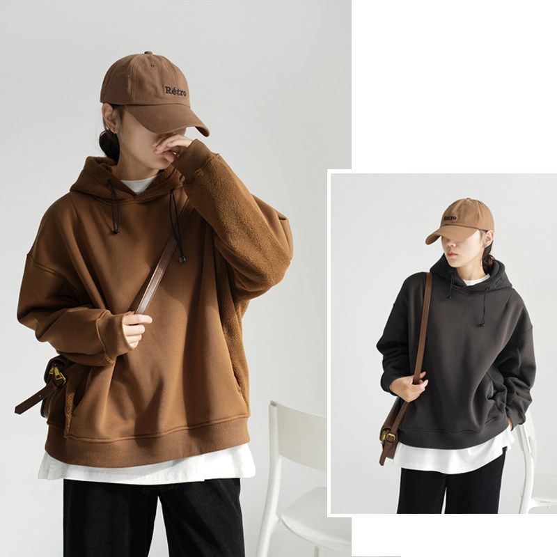 特 加厚款 拼接羊羔绒连帽卫衣 女士一体绒宽松套头衫 秋冬款女装