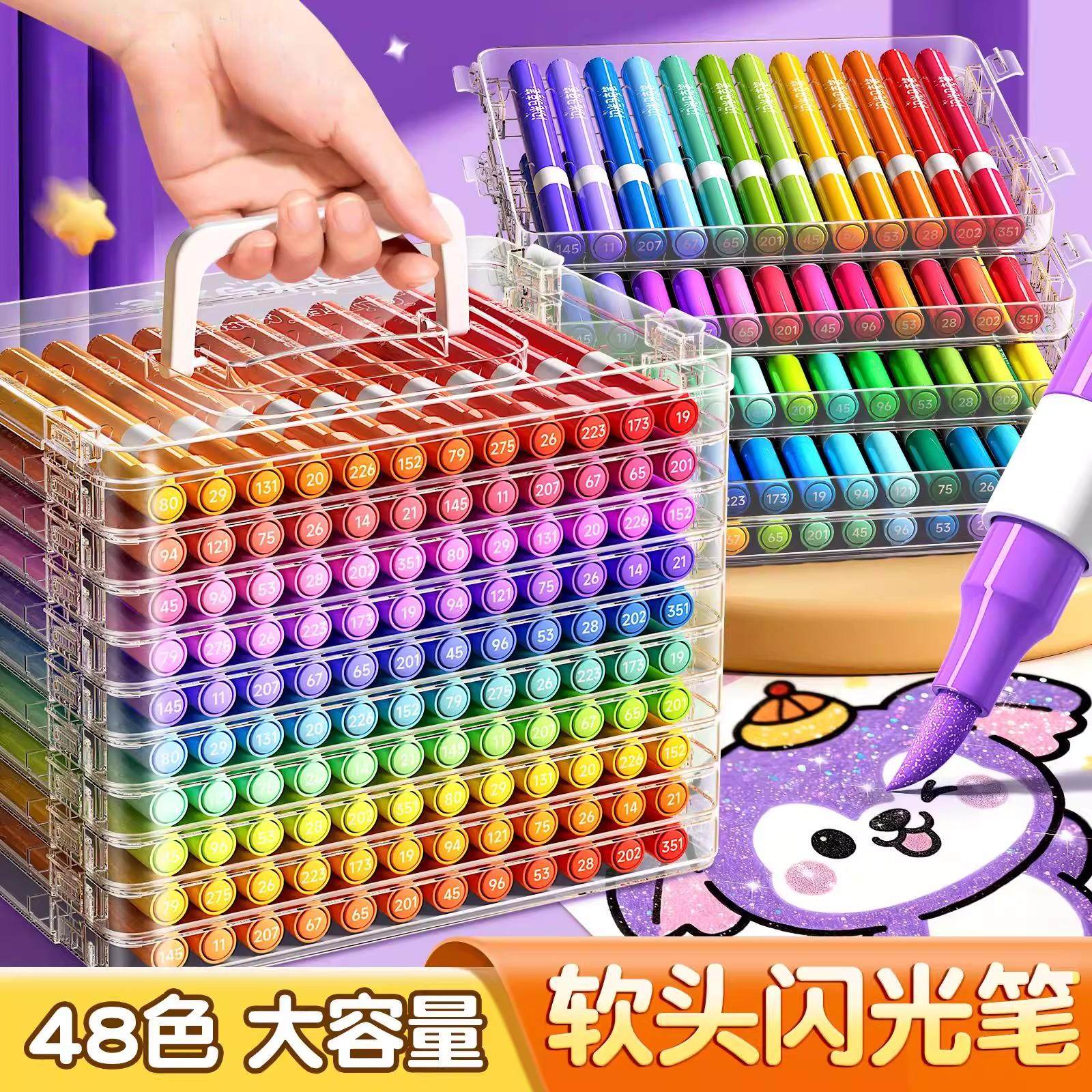 闪光丙烯马克笔软头小学生美术专用水性60色画画笔幼儿园儿童无毒水彩笔荧光笔带闪粉珠光彩色笔爆闪双头发光