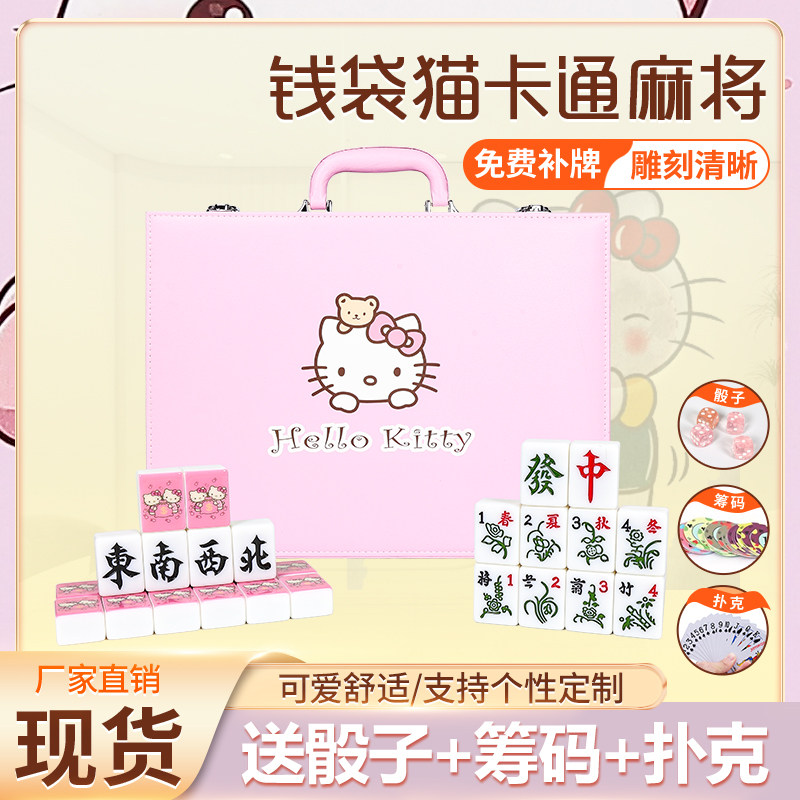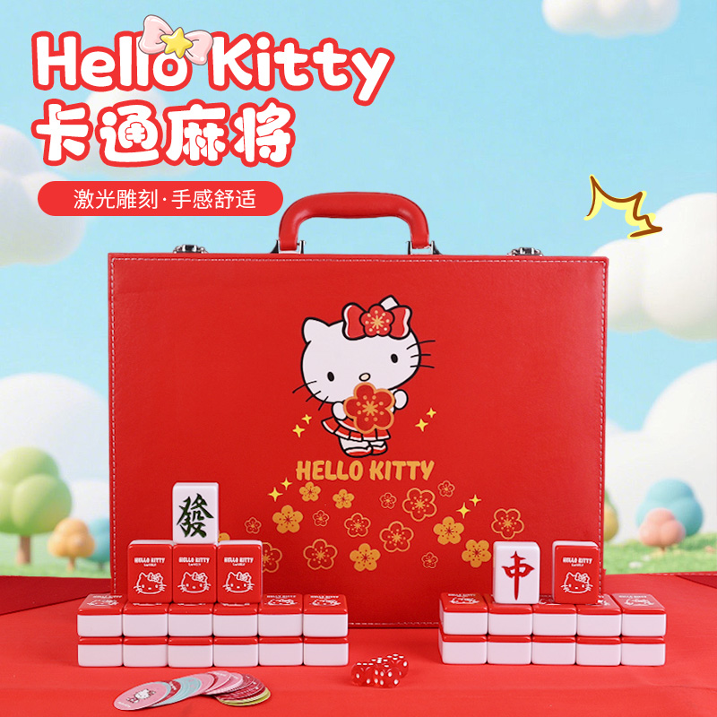 手搓家用麻将牌新款红色KT猫麻将凯蒂猫卡通麻将中大号礼品麻将