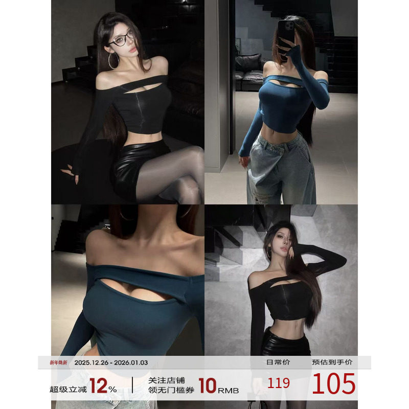 【到手89元】设计感一字肩镂空不规则修身长袖打底衫显瘦露肩T恤