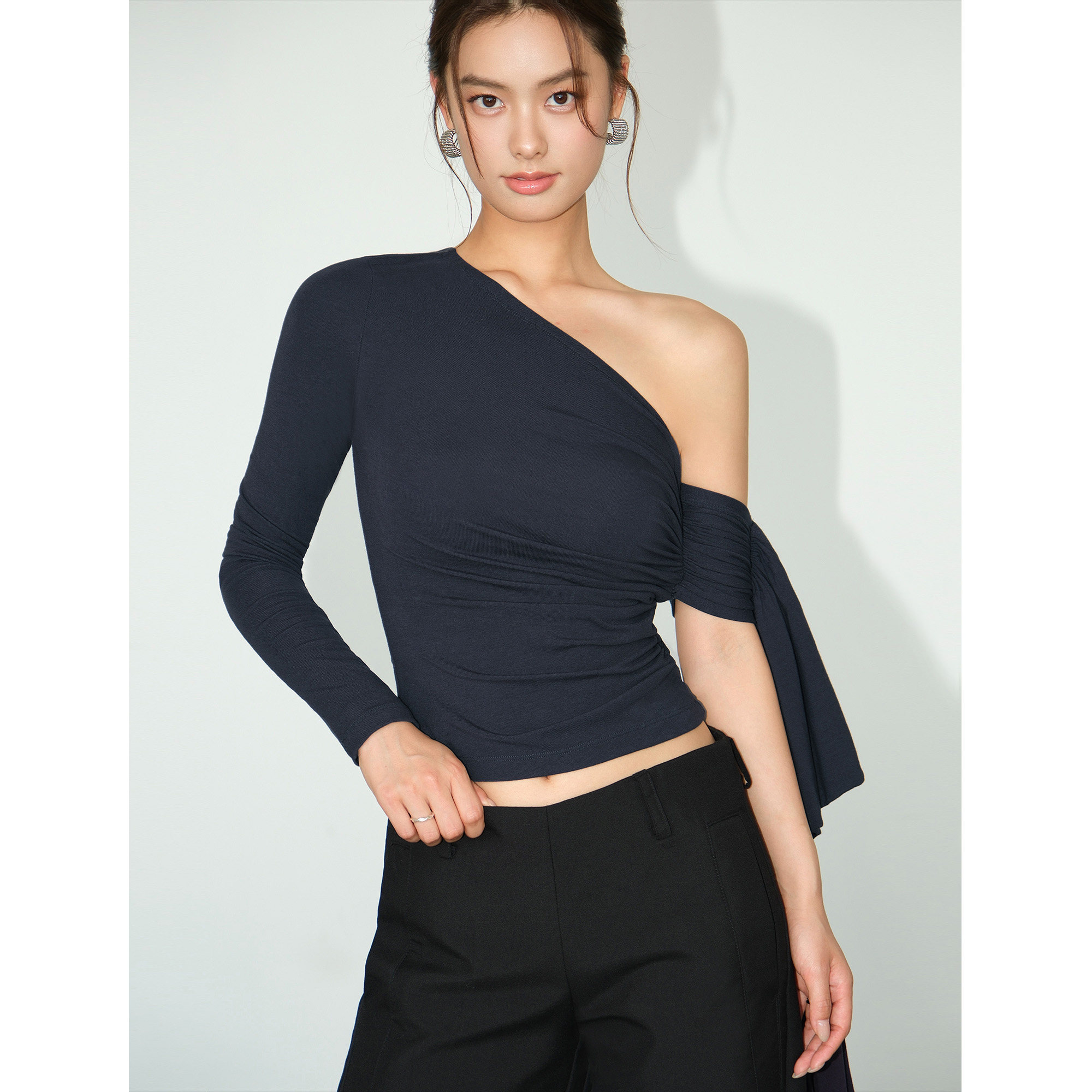 辰米范 简构之美 设计感斜肩修身长袖上衣女收腰针织短款露肩t恤