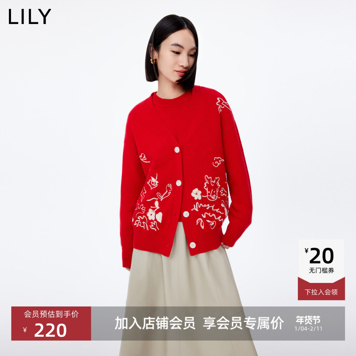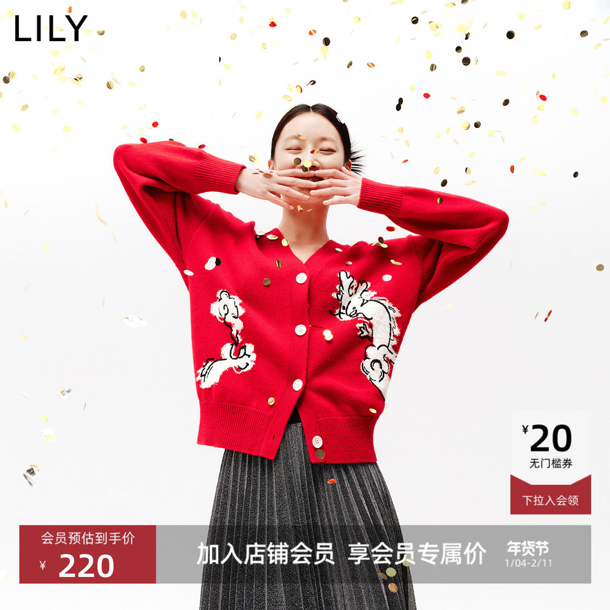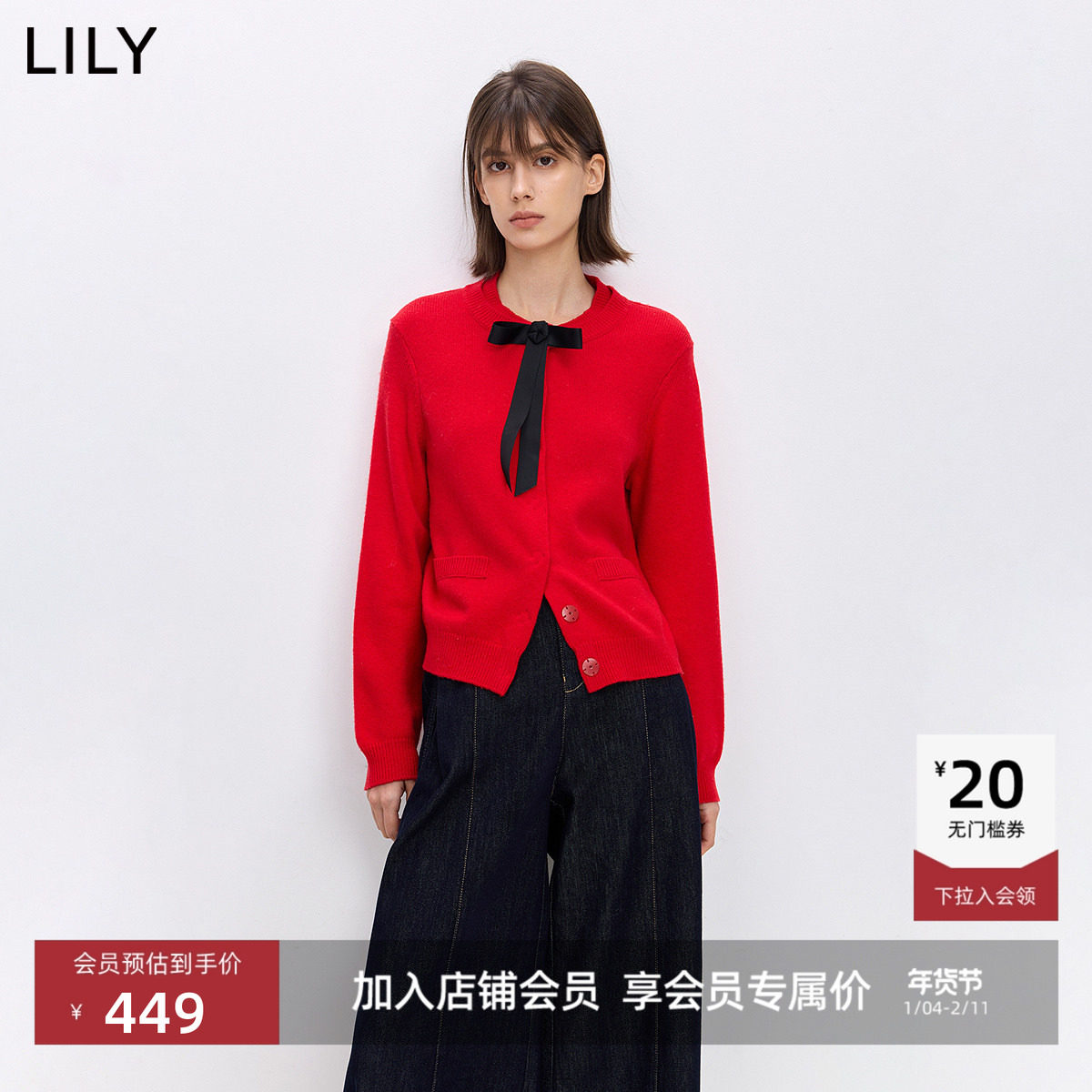 LILY2026春新款女装羊毛混纺蝴蝶结圣诞新年节日红色针织开衫外套