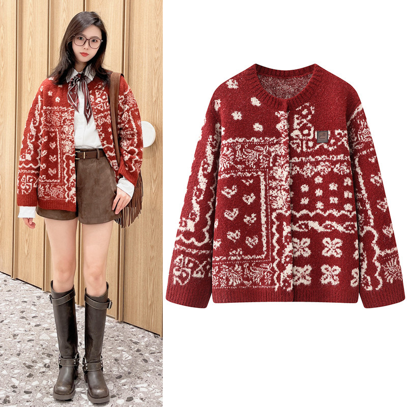 小哲 费尔岛风红色针织开衫女冬季复古提花单排扣毛衣松弛感上衣