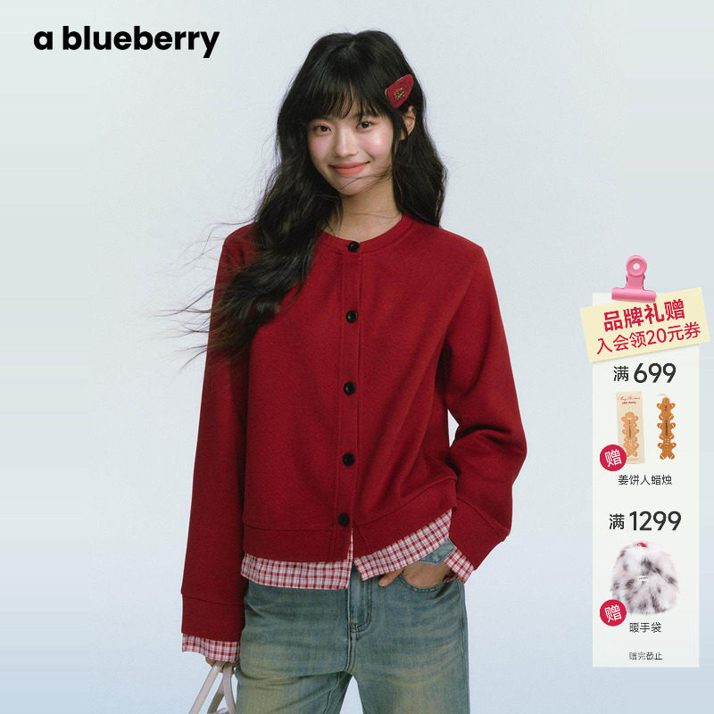 ablueberry 拼接格子外套女26春新款韩系气质新年红色针织开衫女