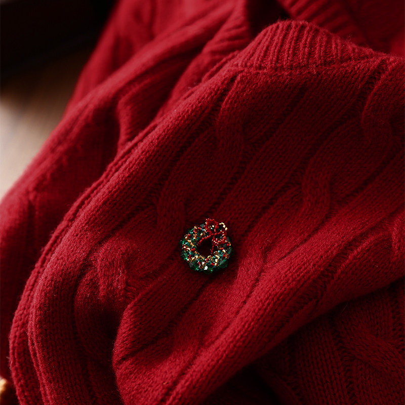 淘么淘 巨美节日配色~纯羊毛麻花圆领圣诞装饰红色针织开衫毛衣女