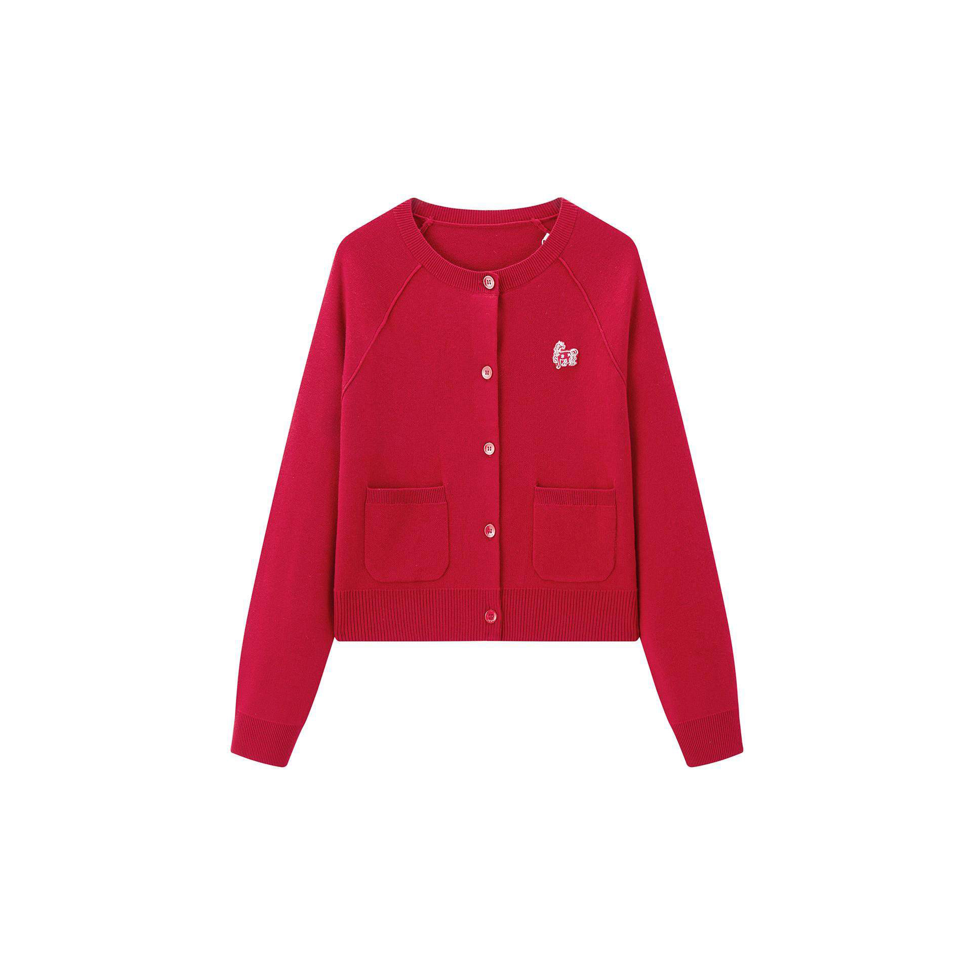 Basic House/百家好新年战袍红色针织开衫女冬季法式钉珠圆领外套