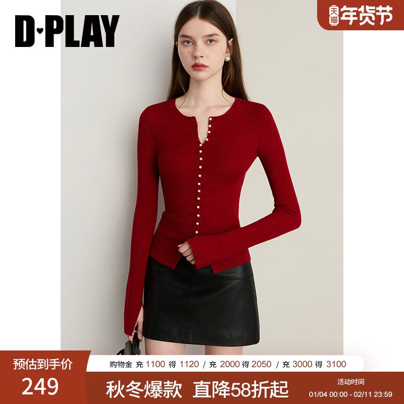 DPLAY2025年秋季新款红色针织开衫女珍珠扣含羊毛圆领时髦女上衣