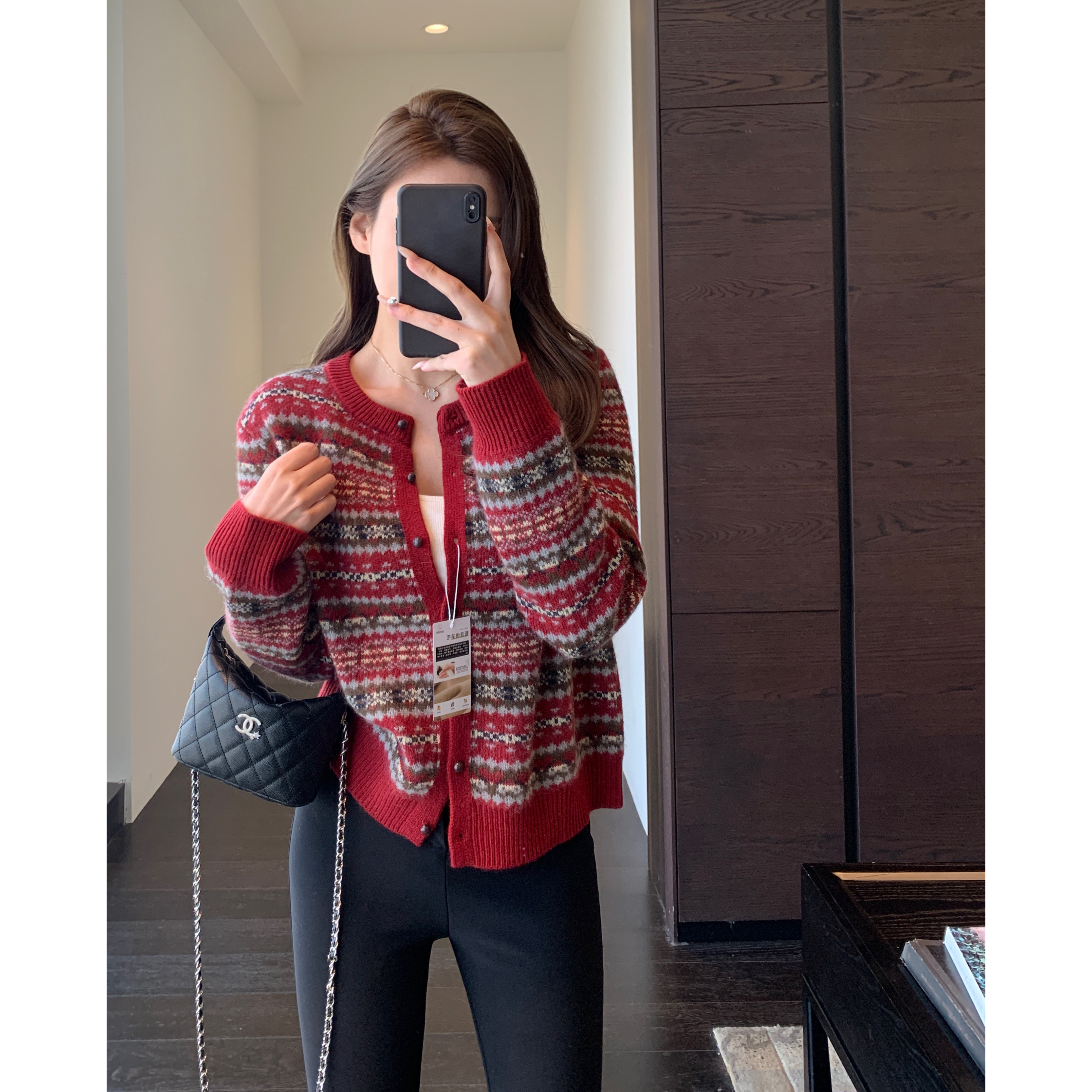 新年红色针织开衫2026春季新品复古费尔岛撞色提花宽松毛衣外套女