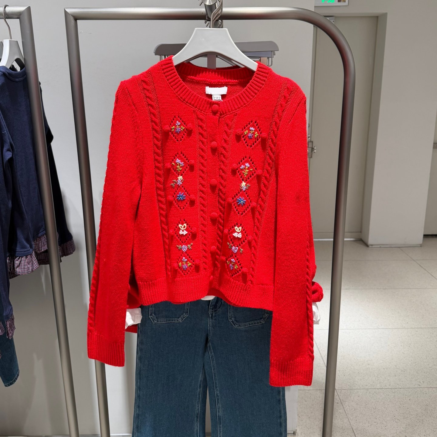 2026春都市缕空花卉刺绣红色针织开衫新年红毛衣女UYU960017