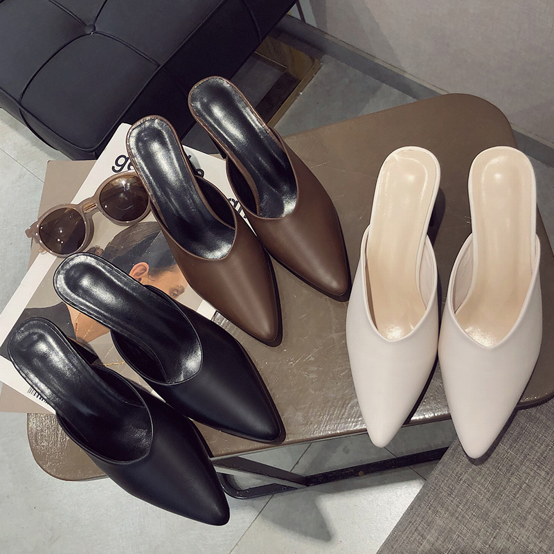 黑色中跟尖头拖鞋女粗跟时尚试衣鞋休闲春夏季包头凉拖高跟半拖鞋