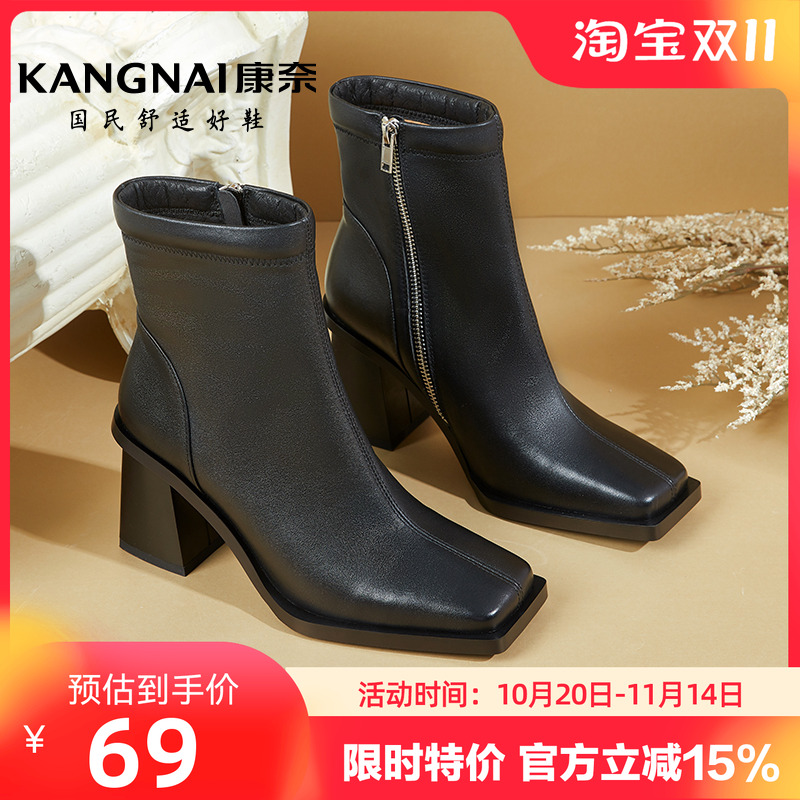 康奈女鞋新款真皮粗跟高跟短靴百搭舒适女士马丁靴通勤鞋工作鞋女