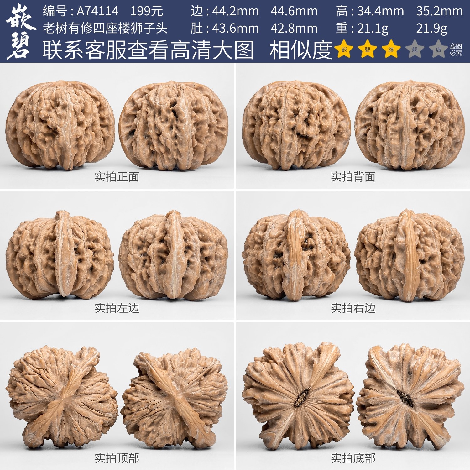 文玩核桃四座楼核桃一物一图A74114老树有修狮子头闷尖大尺寸44mm