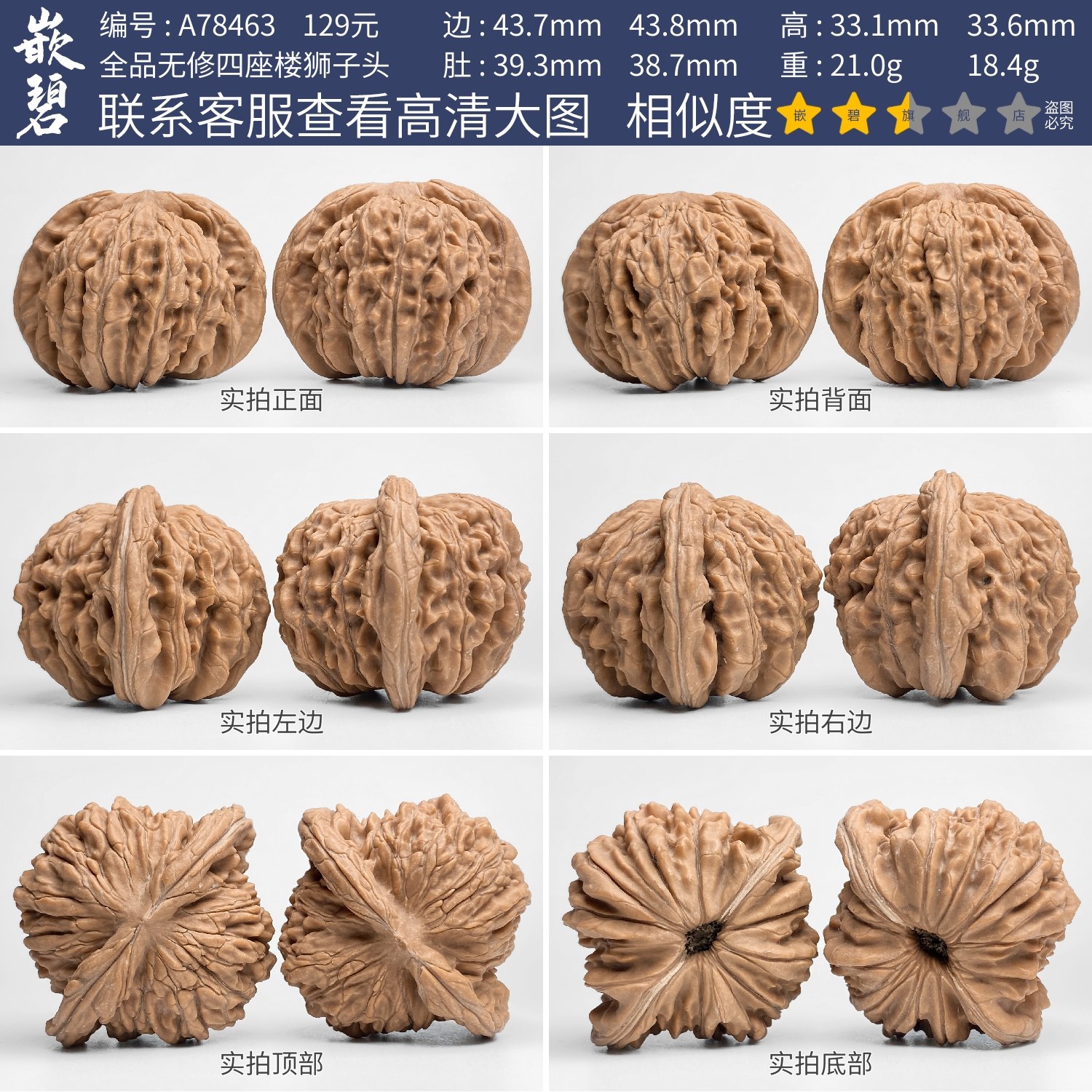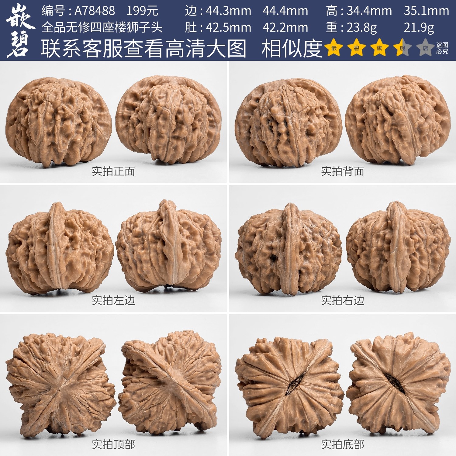 文玩核桃四座楼核桃一物一图A78429全品无修狮子头矮桩大尺寸44mm