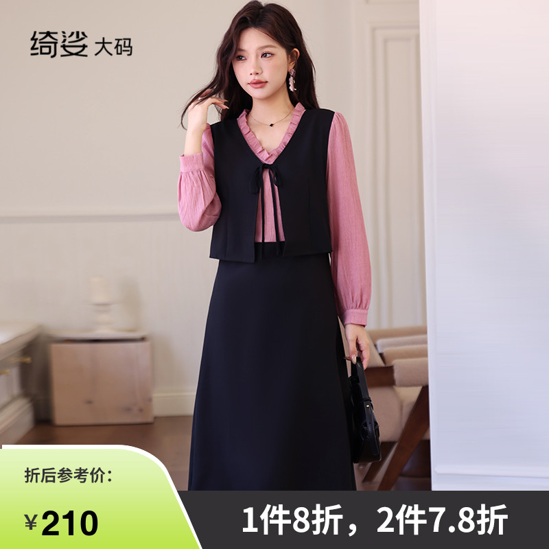 绮娑秋冬装新款法式气质收腰A字裙显瘦大码胖MM长袖假两件连衣裙