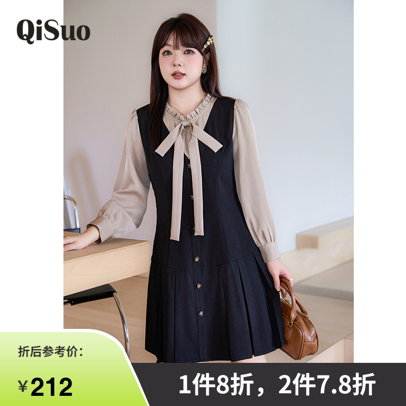 绮娑拼接假两件大码连衣裙秋季新款翻领气质显瘦胖MM收腰A字长裙