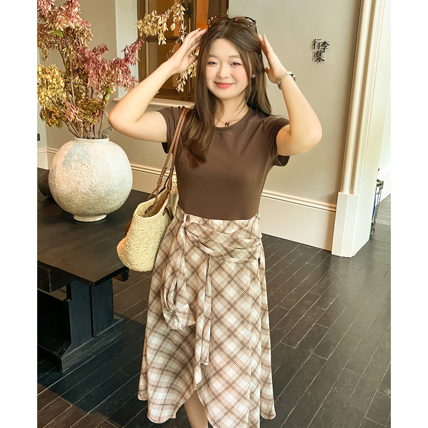 DM100大码百分百女装胖mm秋【草莓奶霜】收腰H版假两件格纹连衣裙