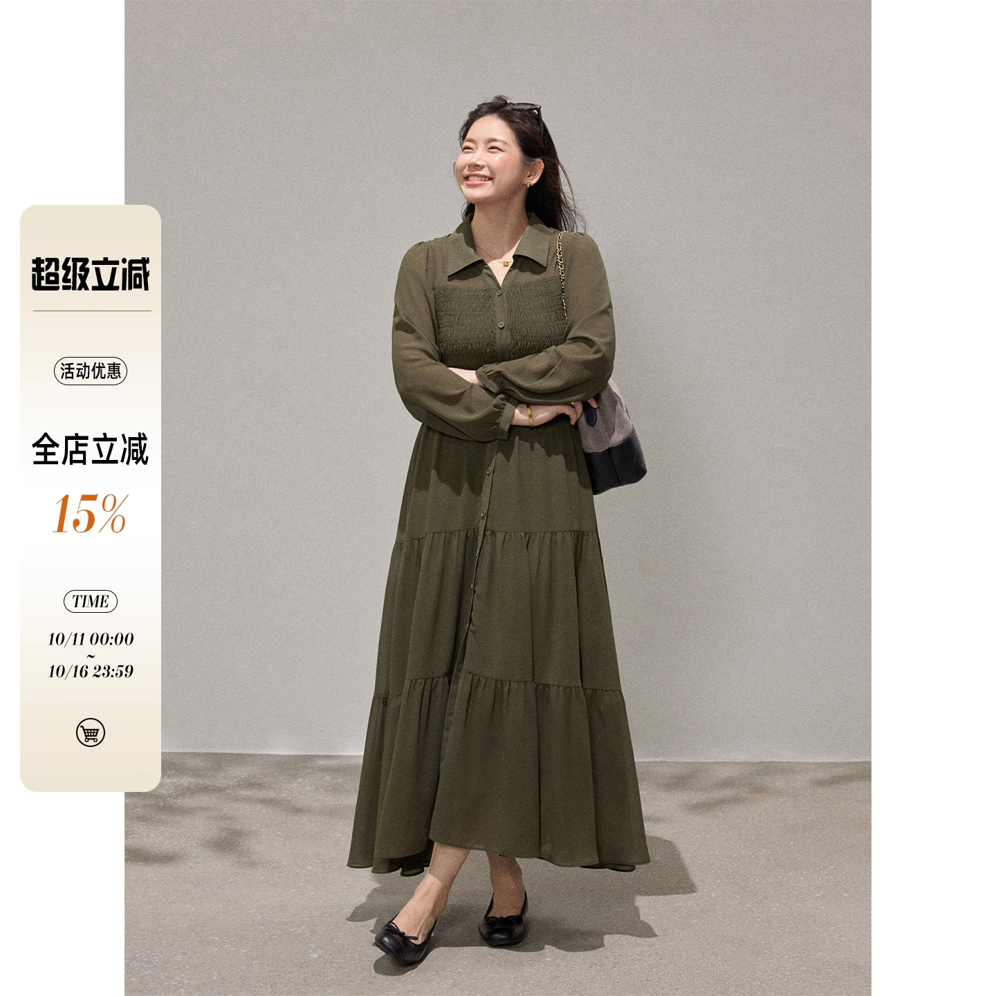 潘不卷大码女装胖mm法式绿色衬衫收腰连衣裙秋季雪纺显瘦蛋糕长裙