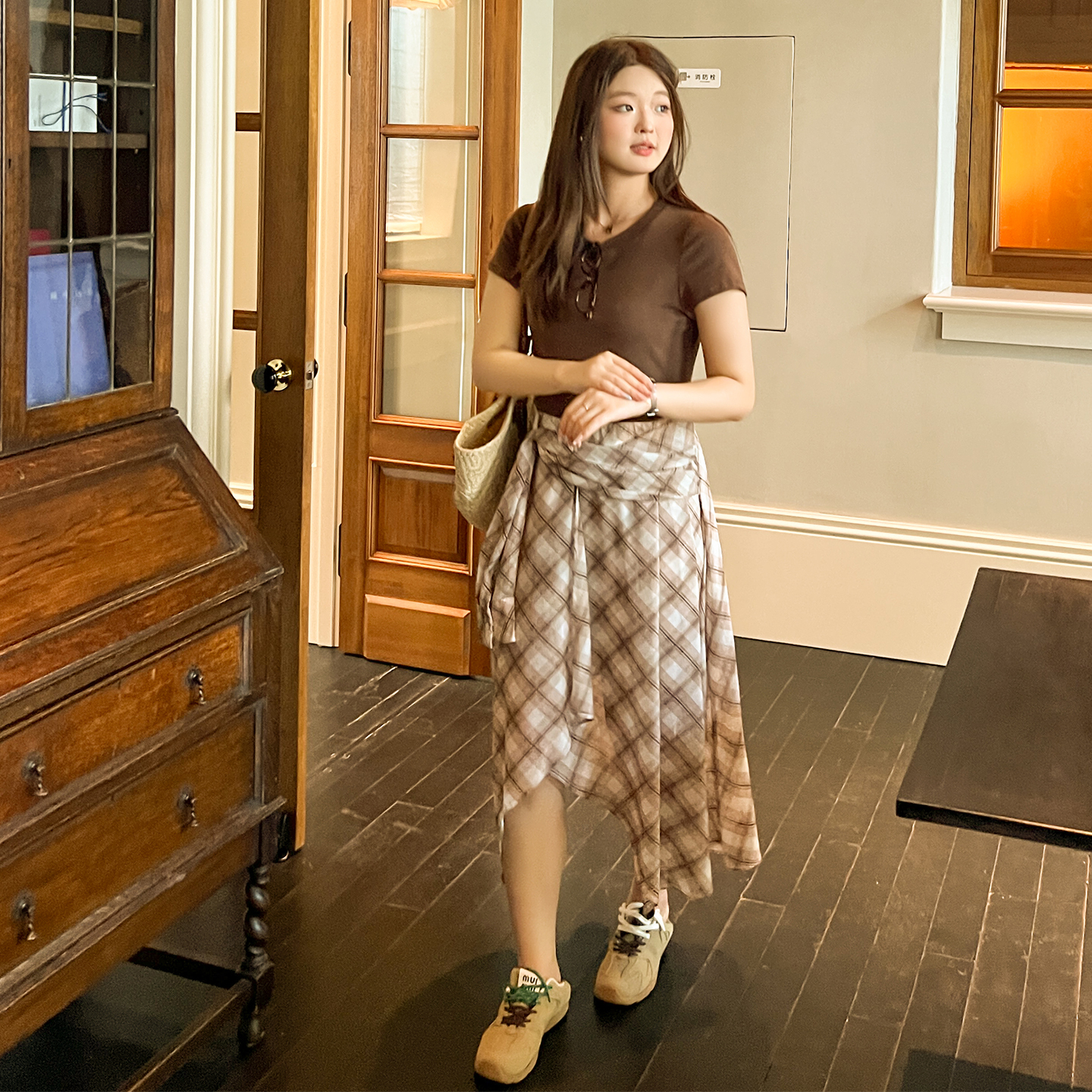 DM100大码百分百女装秋微胖mm复古撞色格纹不规则针织雪纺连衣裙