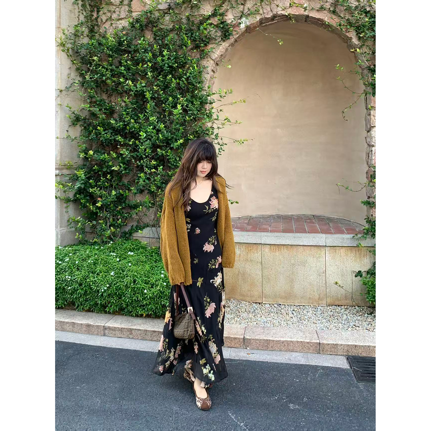 NAZ那子大码秋季新款中古风不规则设计感胖mm宽松减龄印花连衣裙