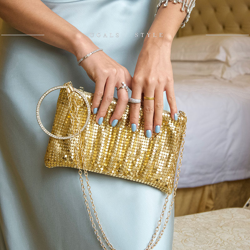 UGALS法式仙女金属亮片闪亮不灵晚宴包圆环链条小方包手拿斜挎包