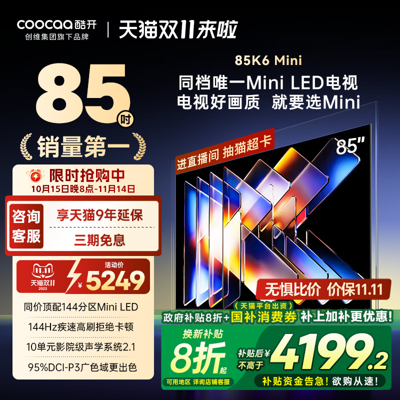 【补贴20%】创维酷开K6Mini 85英寸Mini LED电视2025新款