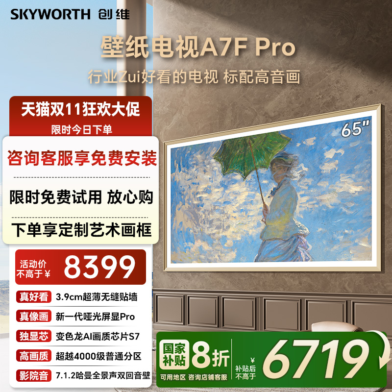 创维壁纸电视A7F Pro 65英寸超薄壁画艺术Mini LED电视机 补贴20%