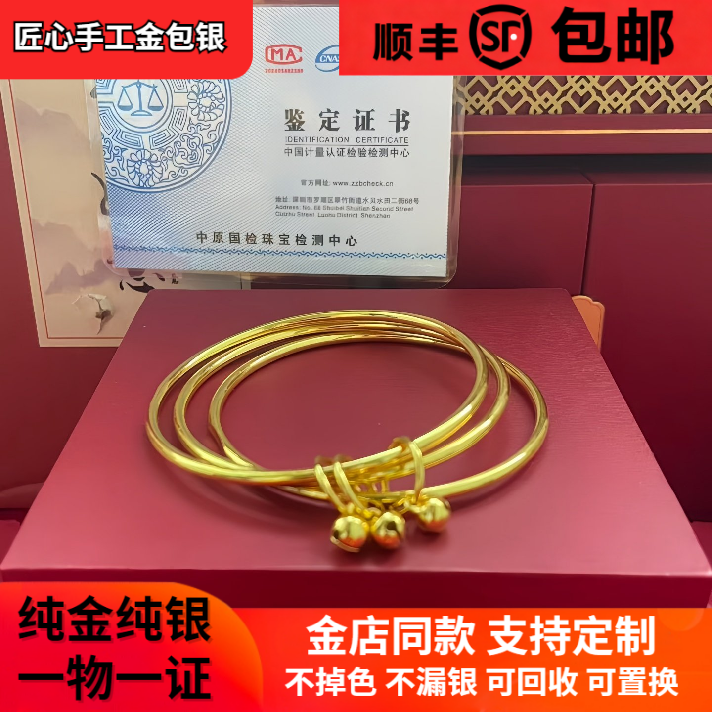香港正生纯银传承手镯女纯银细9999手镯简约三环铃铛叶子三生三世