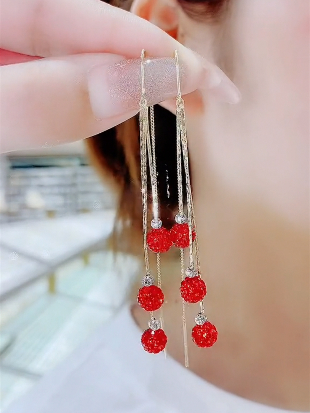 2023新款潮三生三世红色钻球流苏长款耳线女小众设计简约时尚耳环