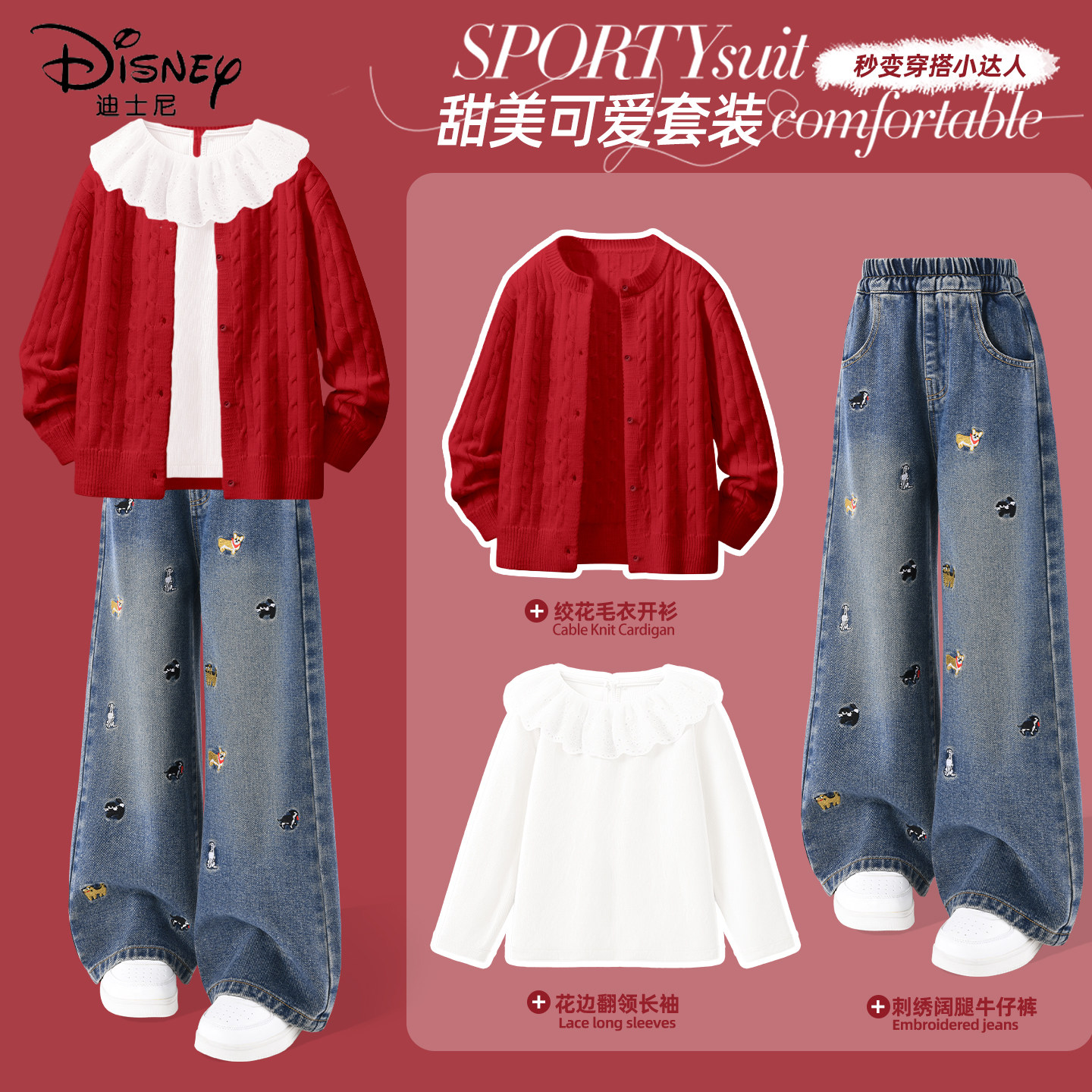 迪士尼女童春装套装2026新款红色过年毛衣休闲好看薄款儿童三件套