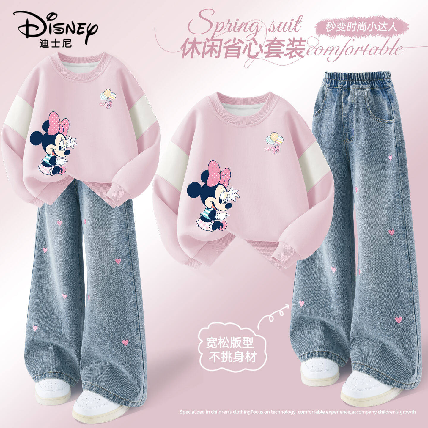 迪士尼女童春装套装2026新款春季薄款新年卫衣潮流儿童刺绣牛仔裤