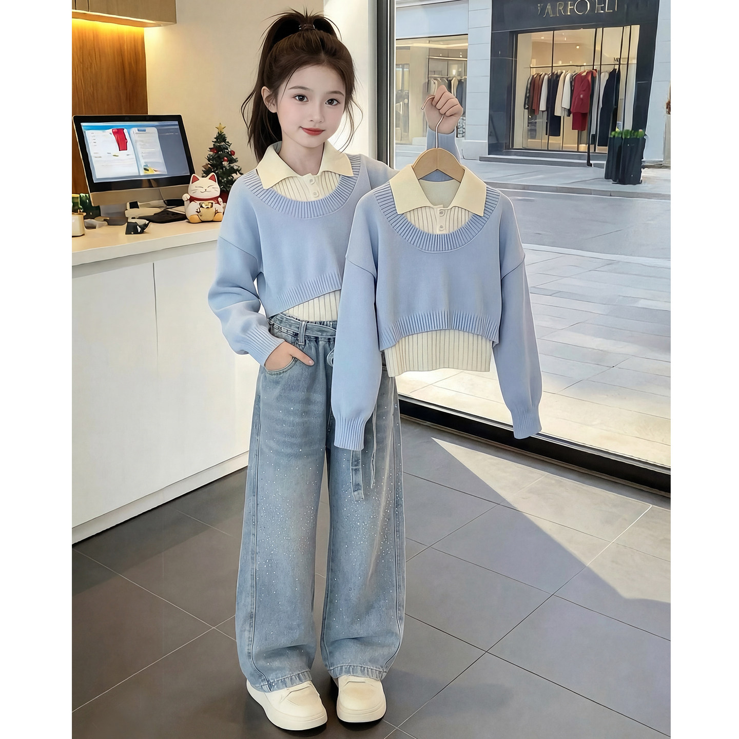 女童春装套装2026新款春秋蕾丝拼接毛衣针织衫女孩秋装牛仔阔腿裤