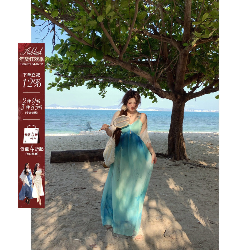 安妮不火 青溪泛玉 海岛风晕染雪纺吊带裙微胖大码度假风连衣长裙