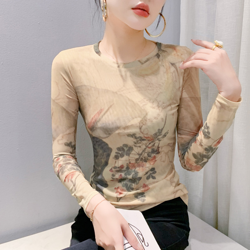 时尚印花网纱打底衫女秋冬新款圆领蕾丝上衣修身显瘦内搭长袖T恤