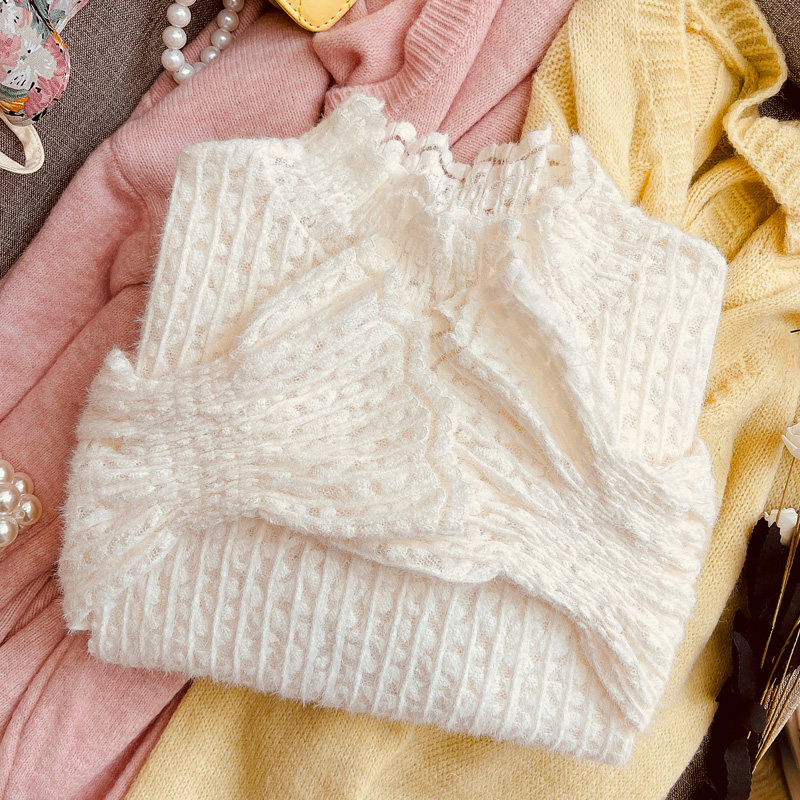Sun雅乔【娇嗔法蕾】秋冬长袖打底衫半高领蕾丝网纱喇叭针织上衣