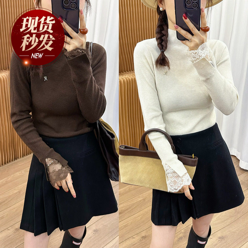 蕾丝半高领毛衣女喇叭袖打底衫2025秋冬新款宽松针织衫内搭上衣潮