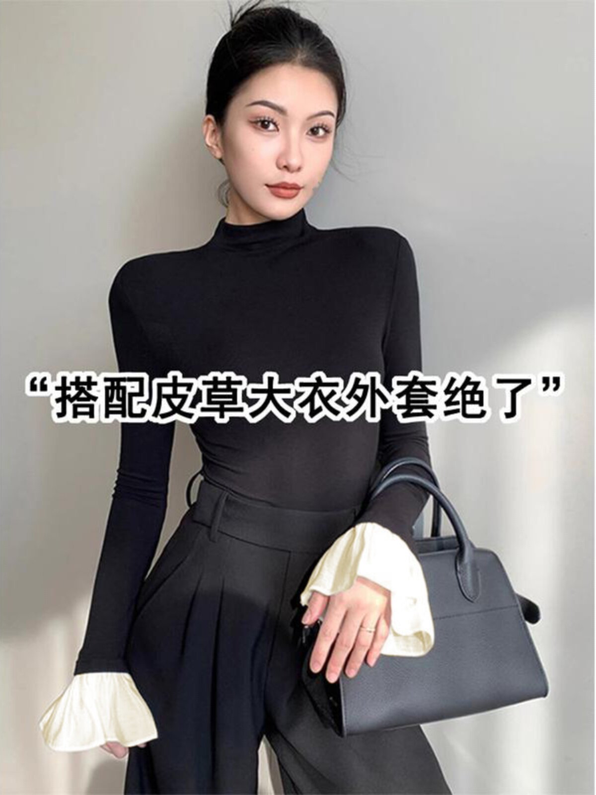 法式喇叭袖小香风洋气T恤打底衫女黑色高领内搭上衣欧货打底衫潮