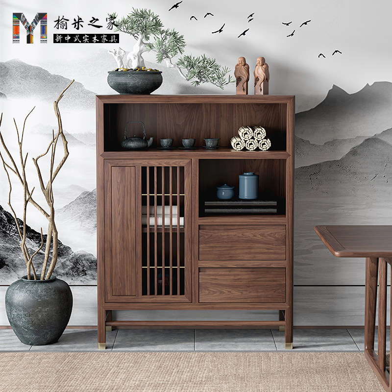 新中式黑胡桃木餐边柜储物柜实木茶室小边柜茶水柜入户玄关柜矮柜