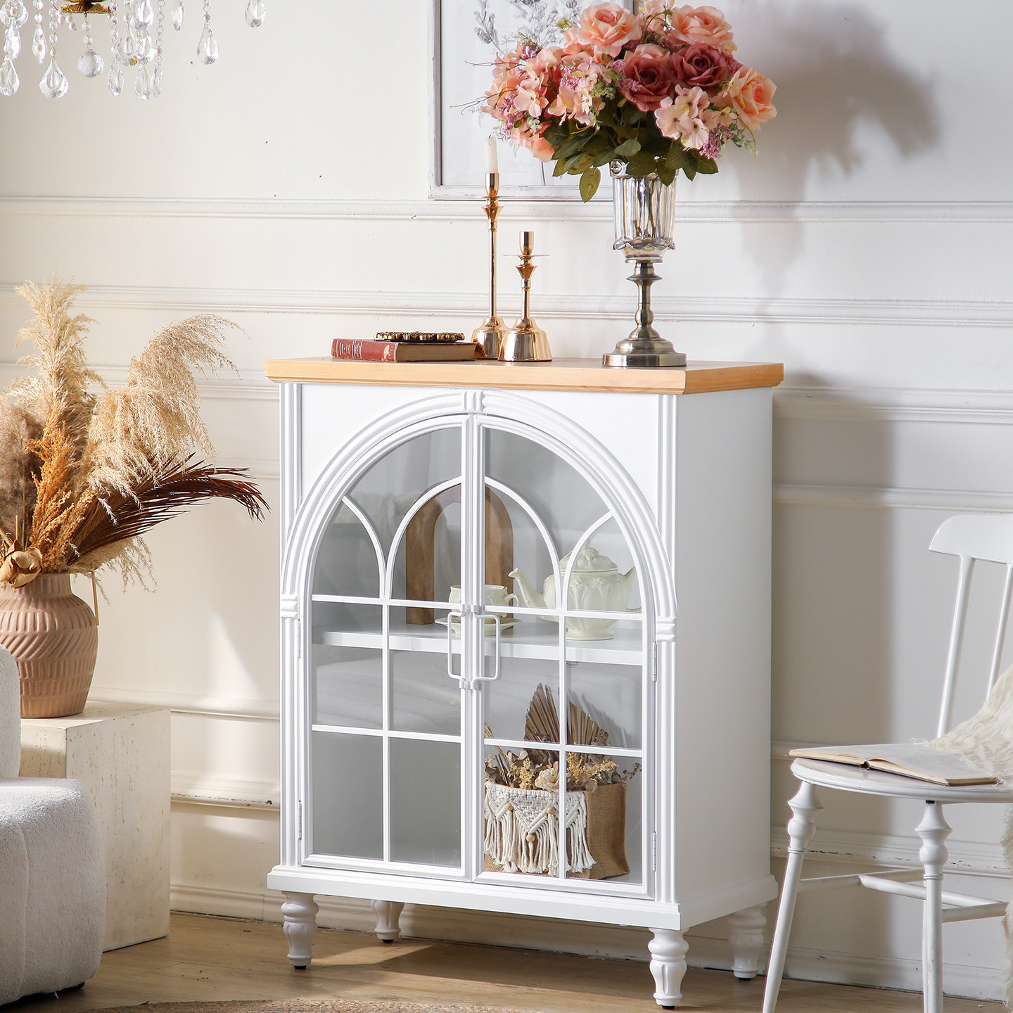 法式复古客厅靠墙落地实木角柜边柜白色玻璃柜子美式餐边柜储物柜