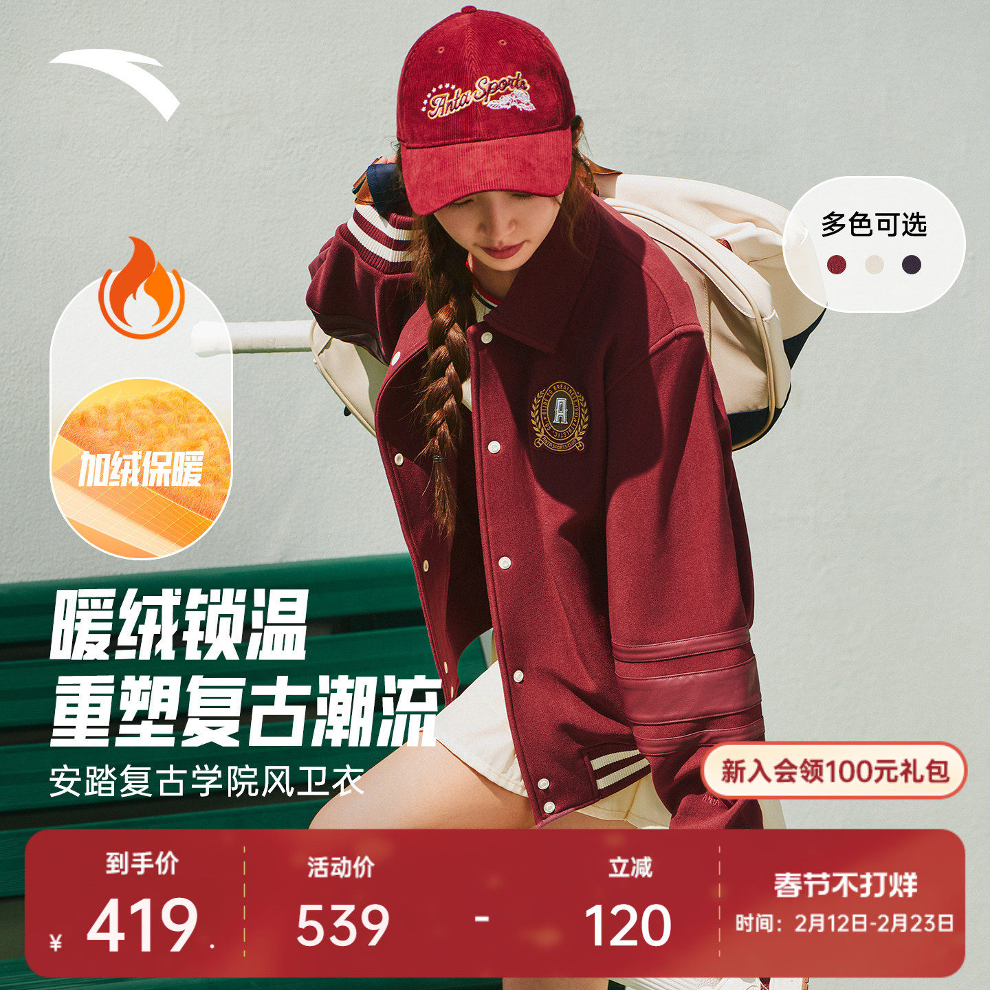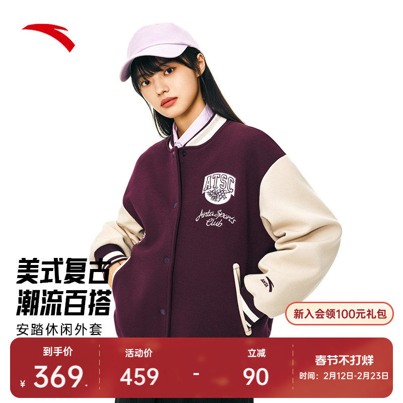 安踏新年棒球服外套女冬季加厚复古学院风开衫休闲上衣162548709N