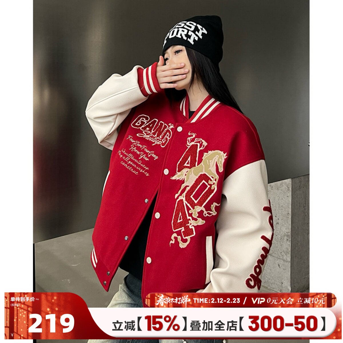404MOB马年2026夹棉加厚毛巾绣红色棒球服男女美式宽松情侣外套潮