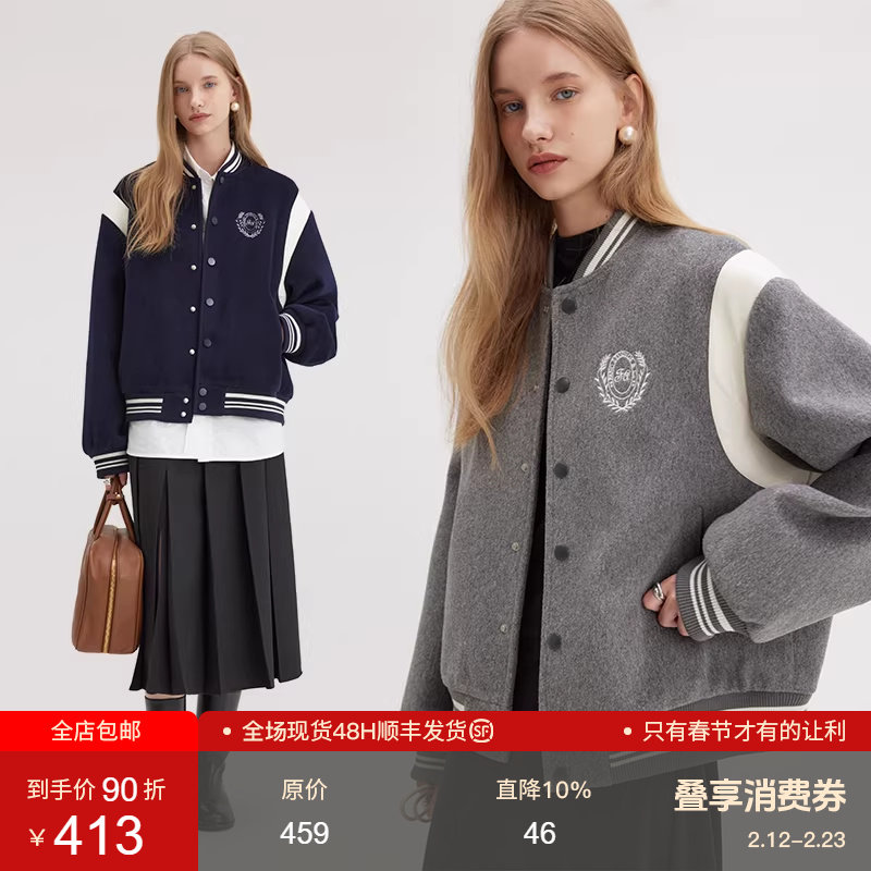 范洛Fano 棒球服外套女冬季复古学院风刺绣减龄毛呢料设计感上衣