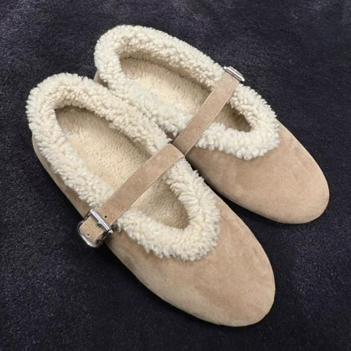 羊皮版~复古皮毛一体浅口一字带玛丽珍单鞋女冬季加绒平底毛毛鞋
