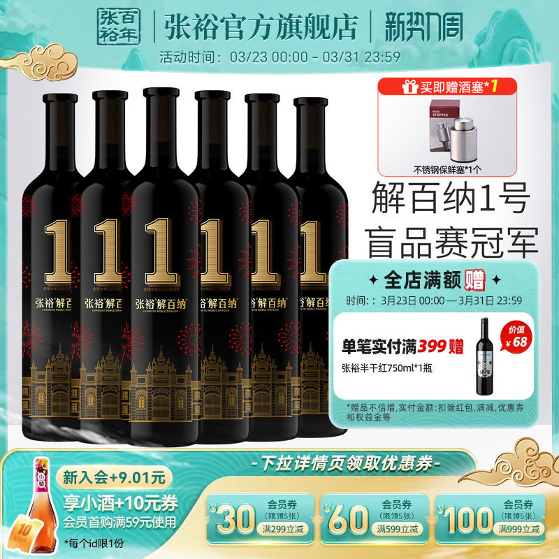 张裕官方九代解百纳1号干红葡萄酒整箱6瓶旗舰店正品橡木桶8个月