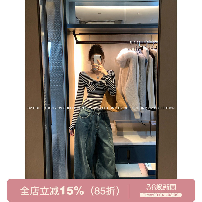 GV大白哥 氛围丹宁 解构立体竖线水洗直筒阔腿牛仔裤设计感裤子女