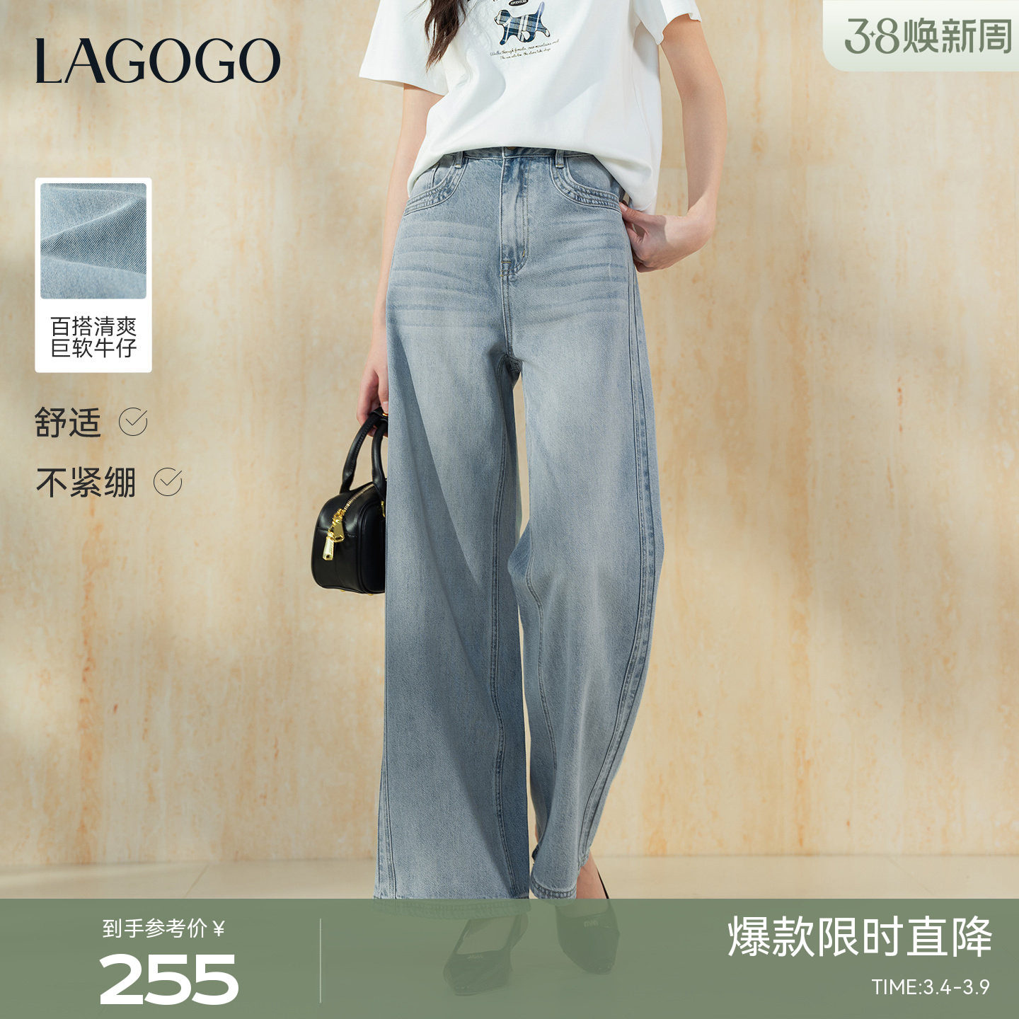 LAGOGO高腰直筒阔腿牛仔裤女拉谷谷2026年春新款浅蓝色百搭休闲裤