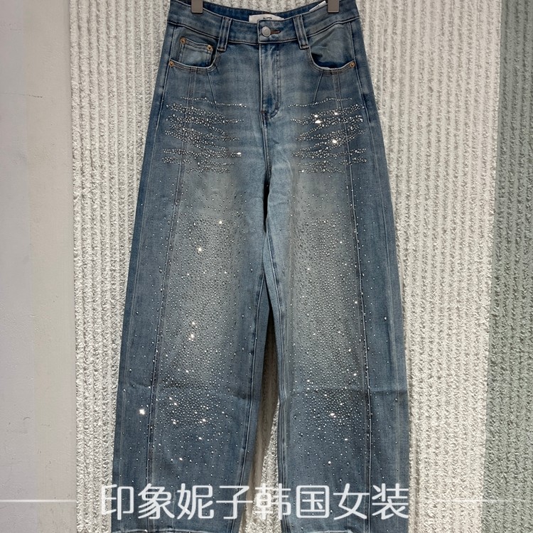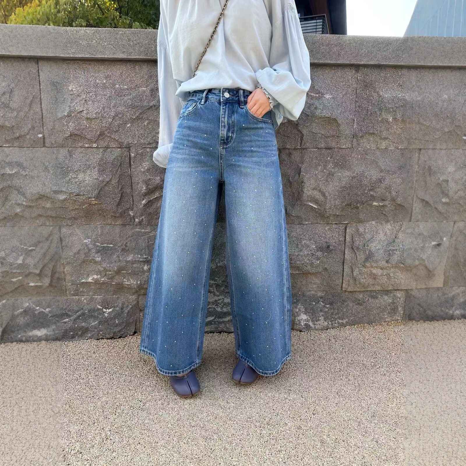 卡蔓诗2933韩系高腰直筒阔腿牛仔裤女2026春款显瘦重工钉珠闪闪裤